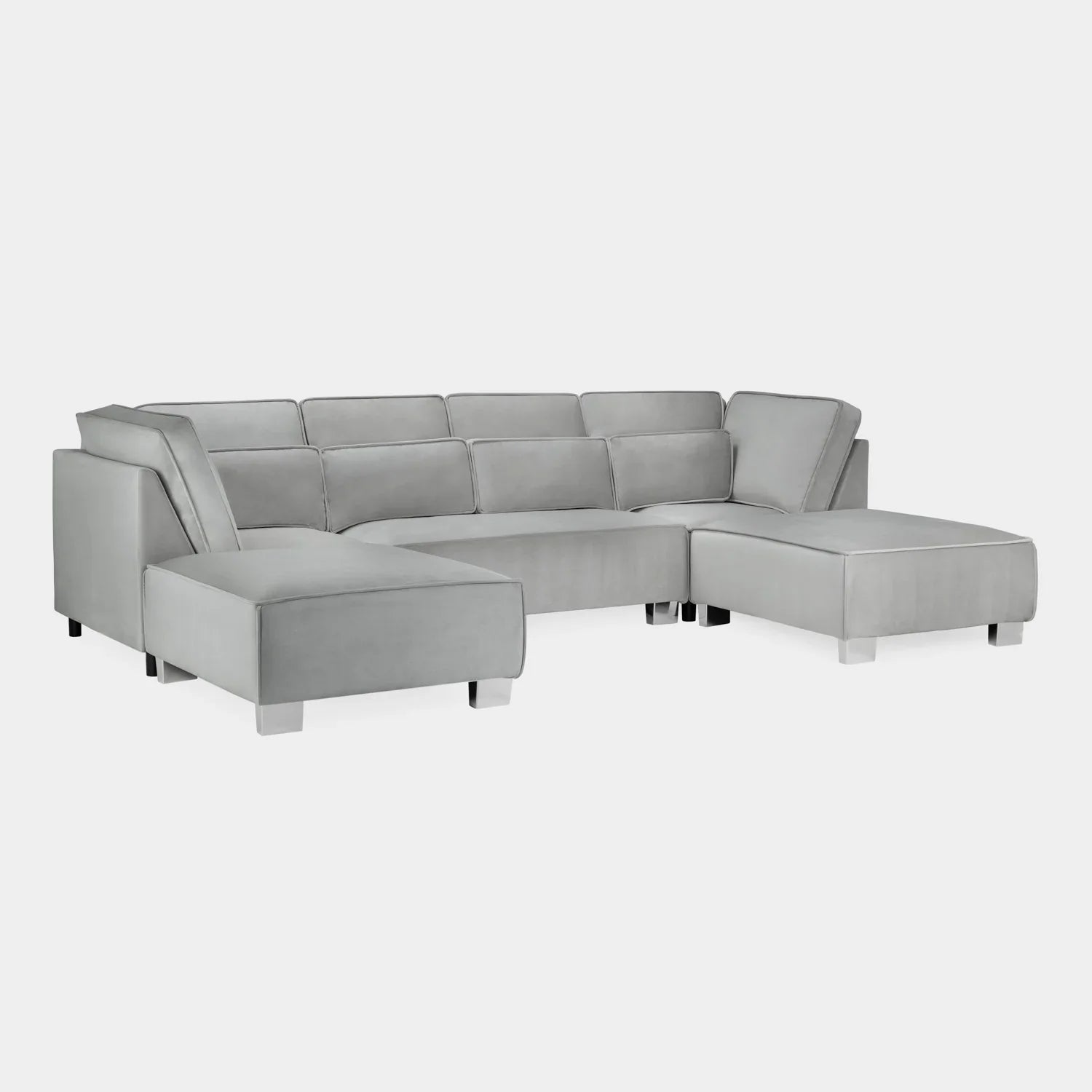 Crafted for best in comfort, the Sloane U-shape sofa in plush grey features luxurious foam-filled seat cushions and a deep, inviting seat for unparallelled comfort. Indulge in plushness with bolsters, all framed by solid wood for lasting comfort.